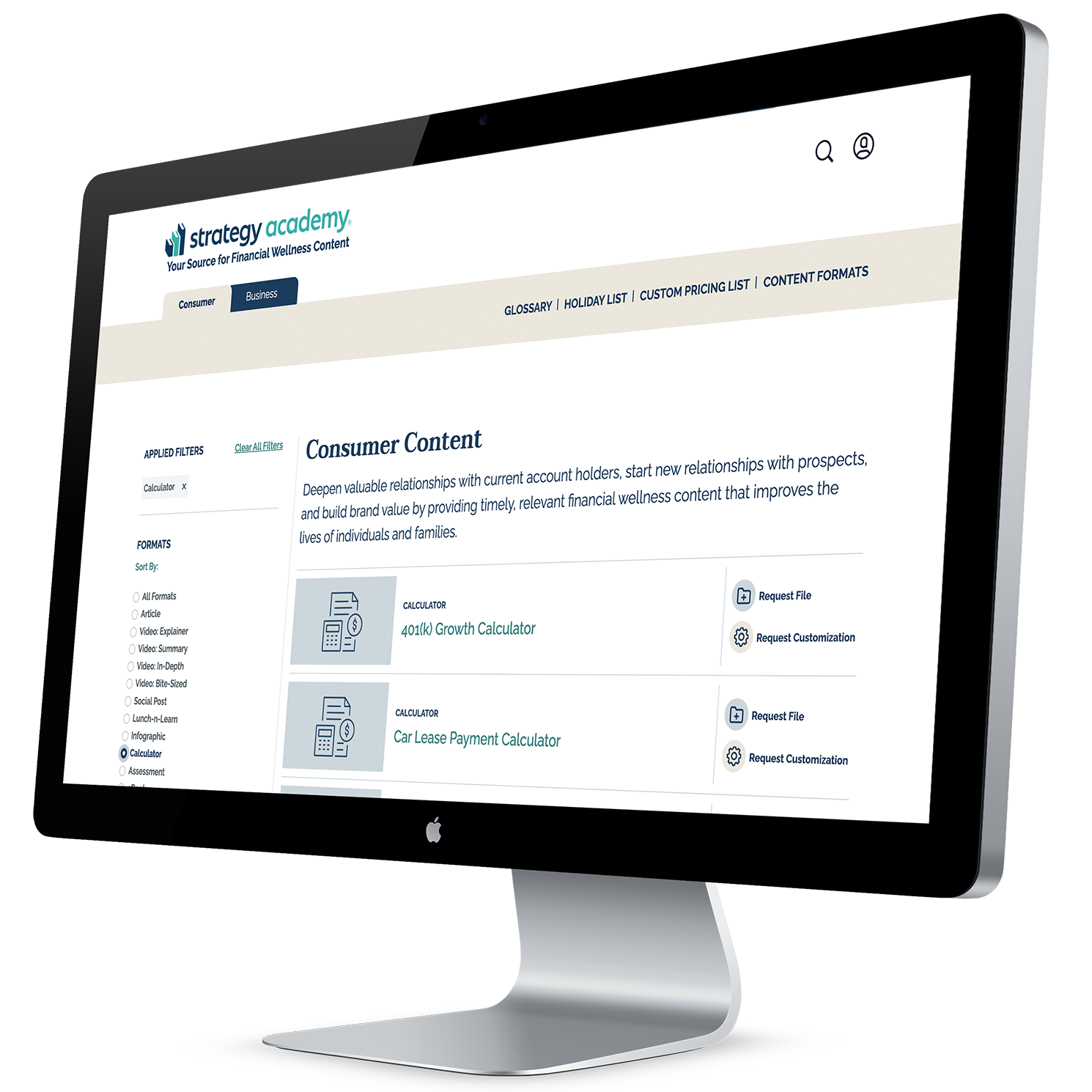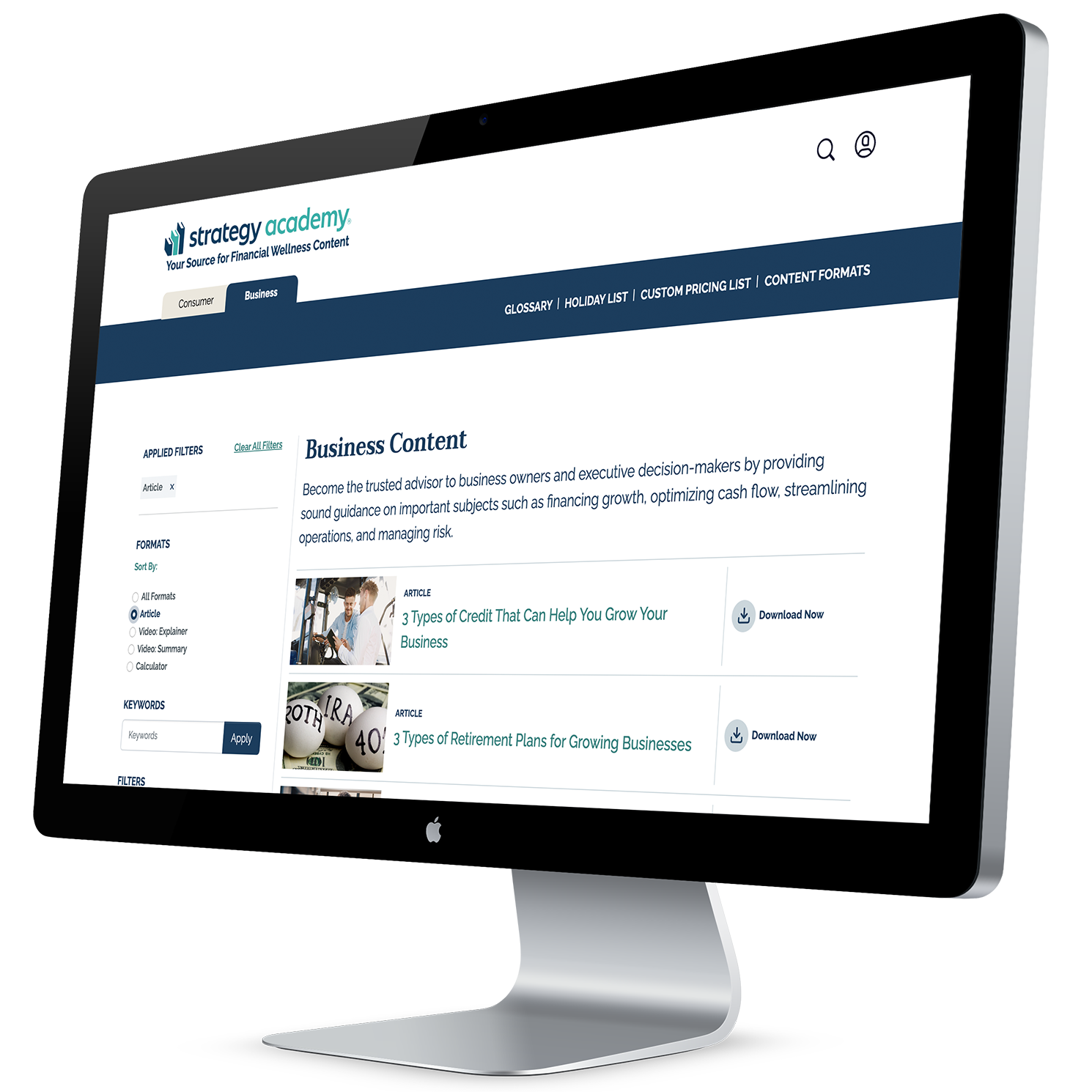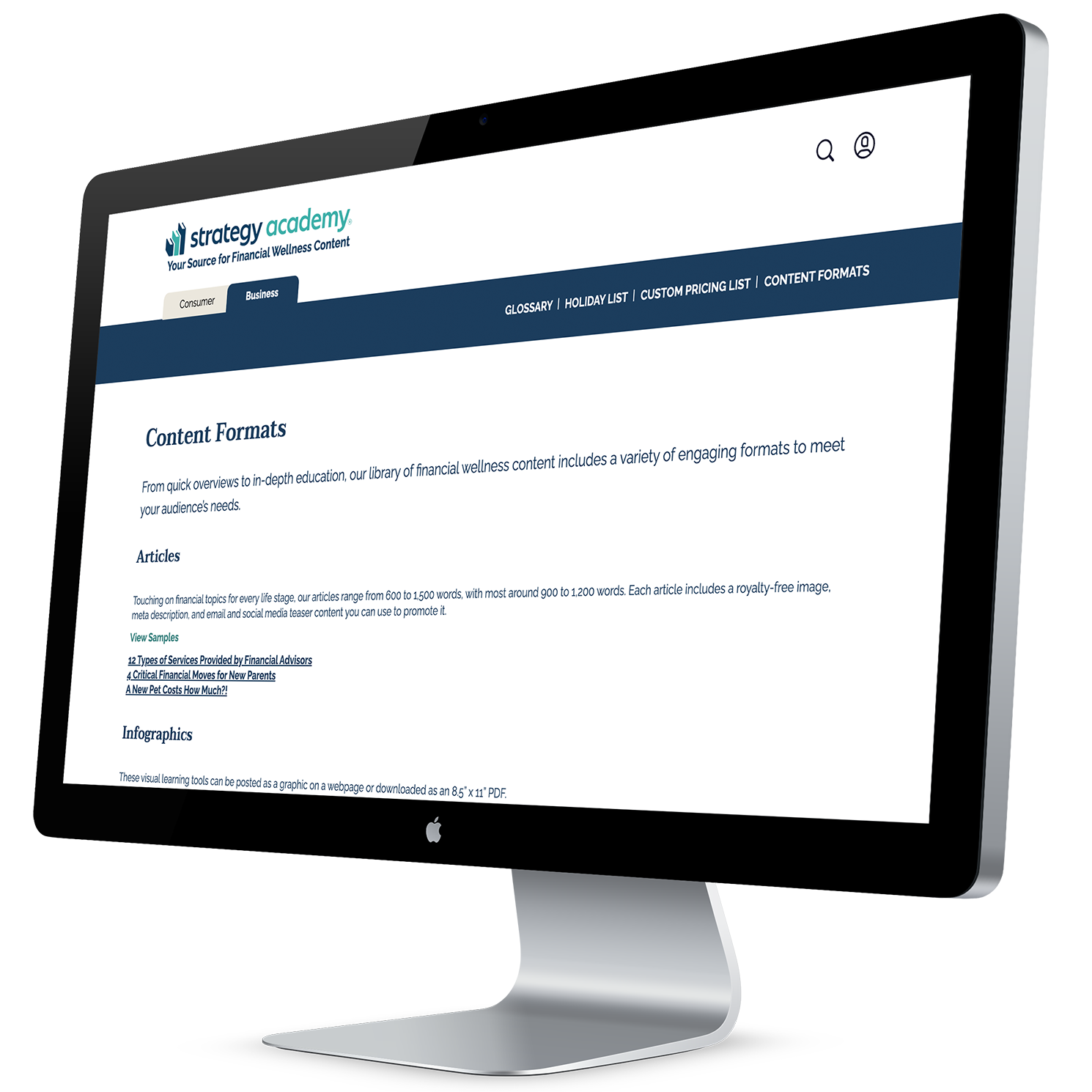 With a $500 per month subscription to Strategy Academy, you’ll get access to hundreds of timely and informative financial wellness blog posts, videos, social media posts, infographics, calculators, and more.