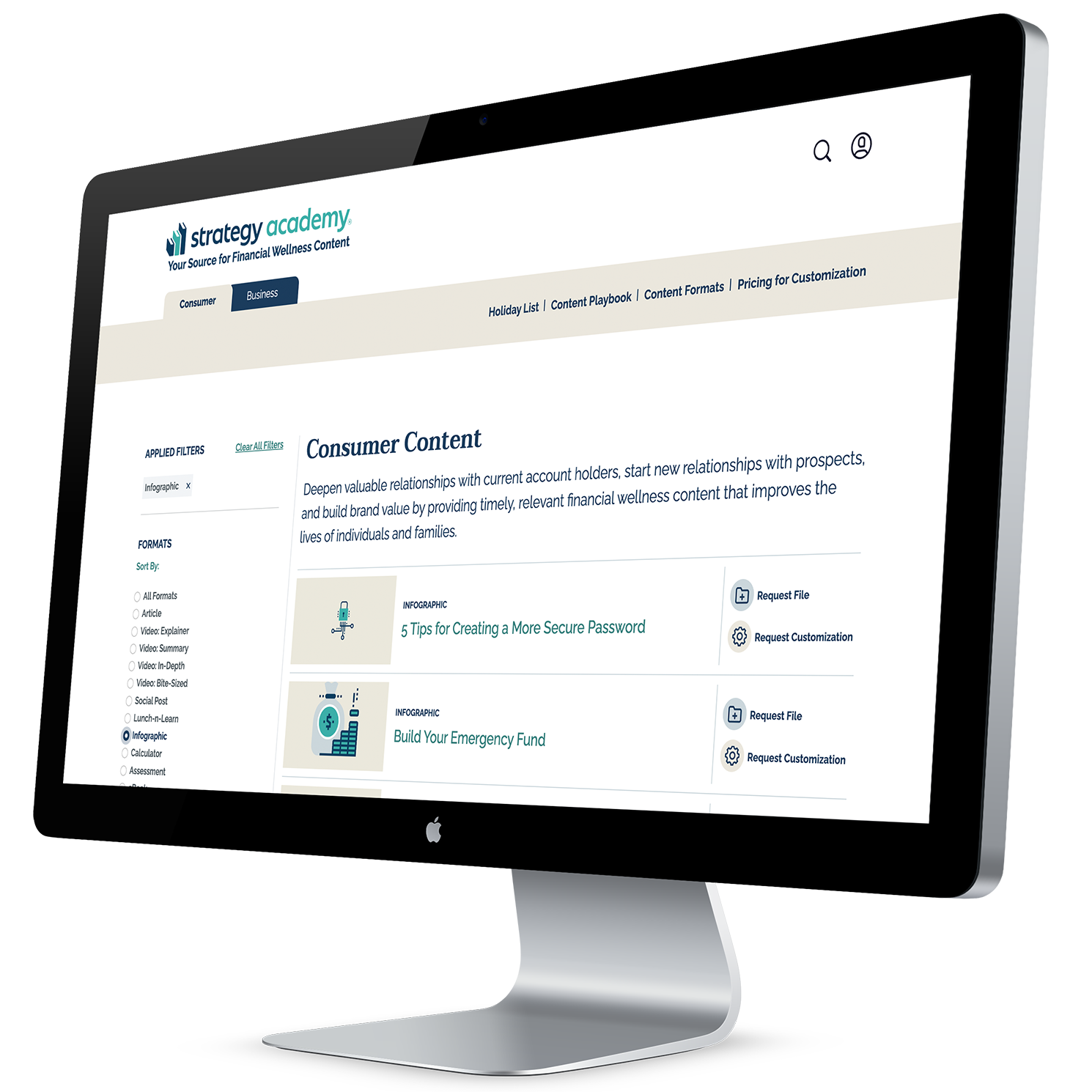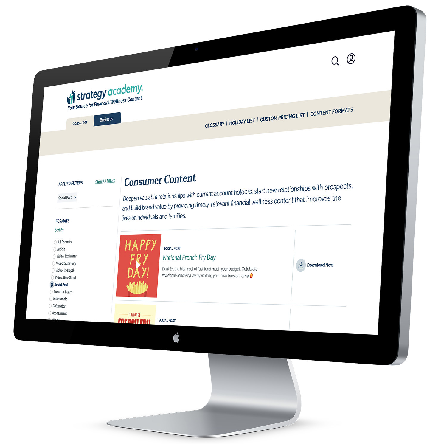 Strategy Academy was designed for community banks and credit unions that want to provide valuable, consistent financial education without creating every piece from scratch. Subscribers across the U.S. use our content daily to grow relationships with accountholders, attract prospects, and strengthen their brand.