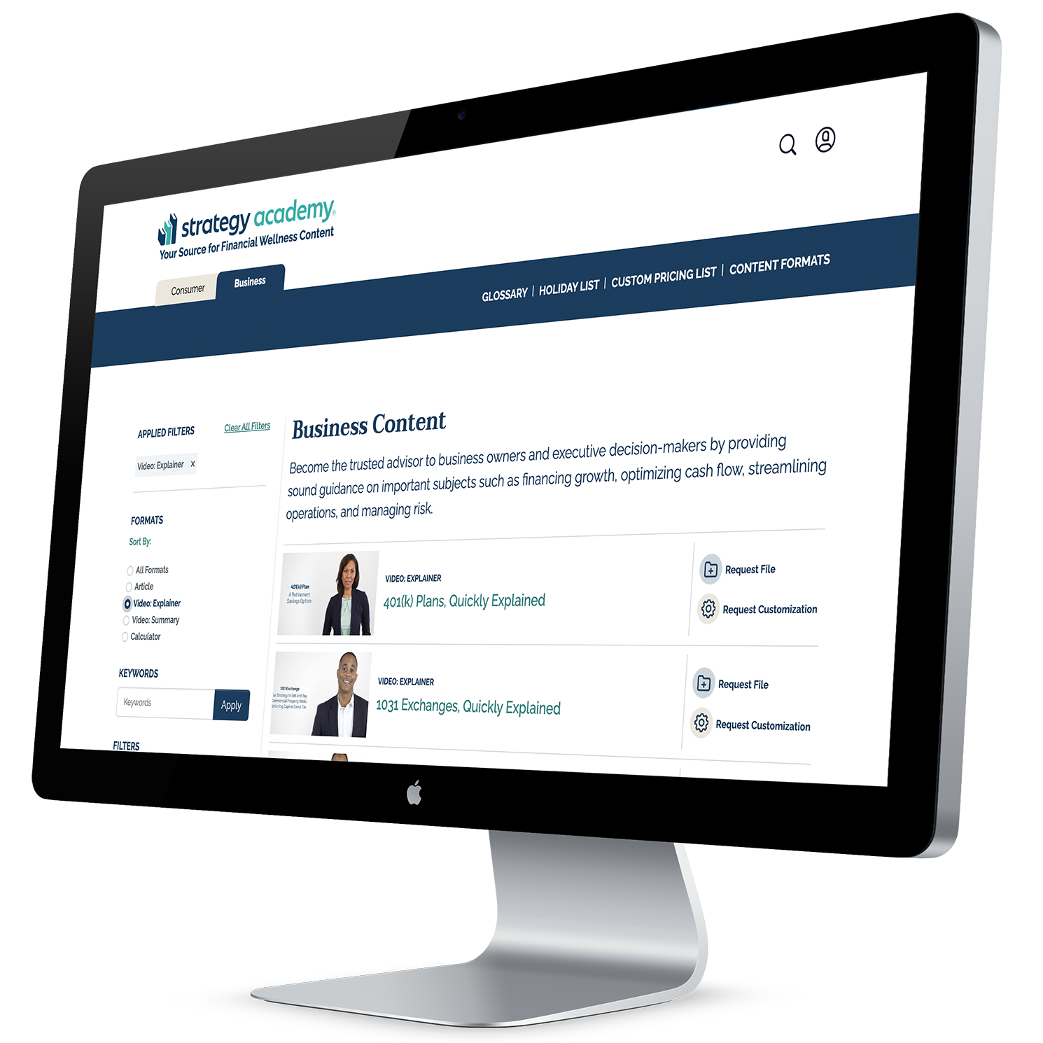 Strategy Academy is an online library of professionally created financial content for both personal and business finance. With a subscription, you get on‑demand access to thousands of ready‑to‑use resources—blogs, videos, infographics, calculators, and more—through an easy‑to‑use online portal. You can even publish content directly to your social media channels right from the portal.